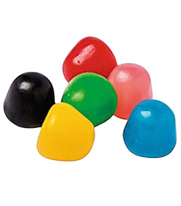 Ingrédients : sirop de glucose; sucre; amidon,; dextrose; acidifiants: acide citrique, acide malique; correcteurs d’acidité: citrate monosodique, malate acide de sodium; arôme; concentré de spiruline; colorants: curcumine, charbon végétal, anthocyanes; agent d’enrobage: cire de carnauba