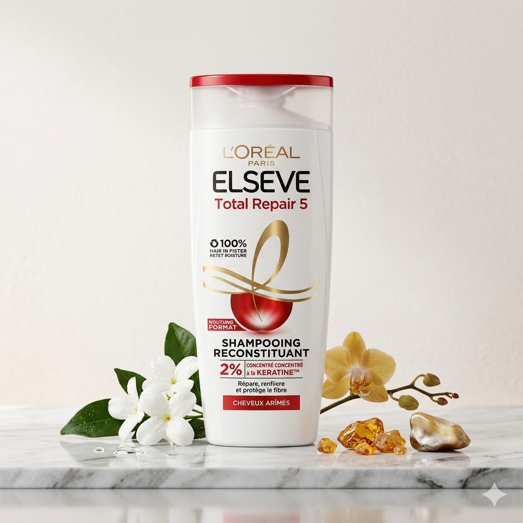 L’ORÉAL PARIS ELSEVE -TOTAL REPAIR 5 -350ML: Fatiguée de vos cheveux abîmés? Le Shampoing Reconstituant Total Repair 5, enrichi avec 2% de concentré réparateur à la KÉRATINE, ravive instantanément les cheveux très abîmés**. Il répare et renforce la fibre** pour des cheveux soyeux, pleins de vie. 1 solution pour combattre les 5 symptômes des cheveux abîmés : 1. Effet paille 2. Casse 3. Sécheresse 4. Manque de souplesse 5. Fourches. Contenance 350ml.